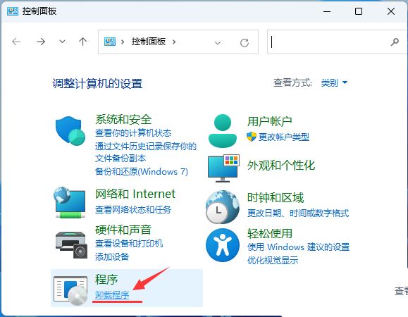 3. 控制面板窗口,切换到【类别】查看方式,然后点击调整计算机的设置下的【卸载程序】;