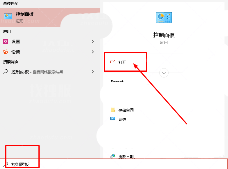 1. 单击左下角开始菜单旁边的搜索。在搜索框中输入:控制面板,然后点击打开系统给出的最匹配的控制面板应用;