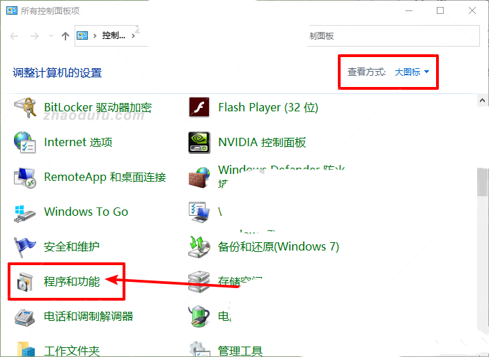 2. 在所有控制面板项目窗口中,切换到大图标的查看模式,然后找到并点击程序和功能;