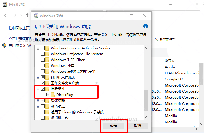 5. 打开Windows 功能组件列表,找到并勾选旧版组件下的【DirectPlay】,再点击【确定】,即可设置完成。