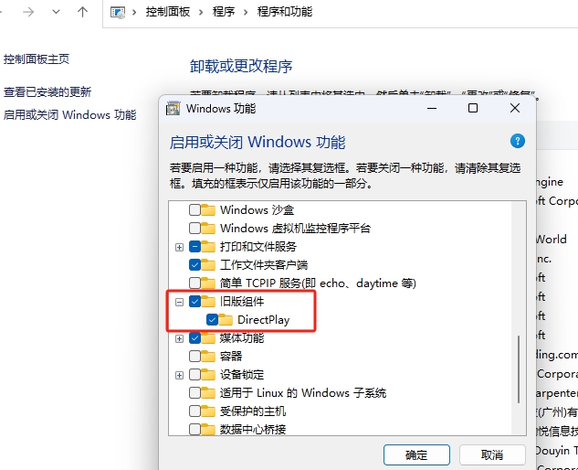 4. 在Windows功能窗口中,启用或禁用Windows功能。在旧组件下找到并检查DirectPlay功能,最后点击确定,等待系统添加功能。